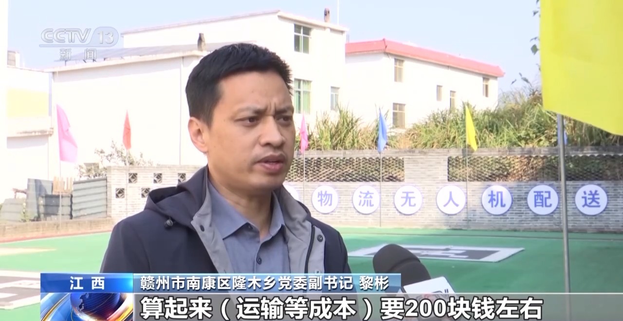 赣州市南康区隆木乡党委副书记 黎彬:如果他们自己运输,有来回的路费、车油费,还有一些损耗,一天下来,运输等成本要200元左右。无人机运输时间只要十几分钟,我们核算了一下成本只要十几块钱。