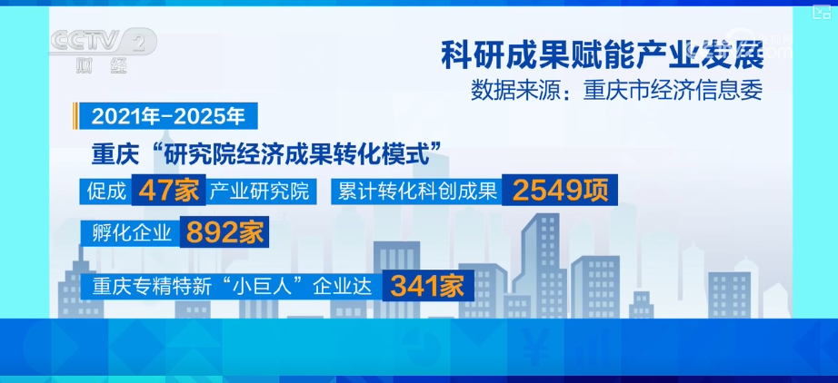 2021年到2025年,重庆“研究院经济成果转化模式”,促成47家产业研究院累计转化科创成果2549项、孵化企业892家。目前,重庆专精特新“小巨人”企业已达341家。