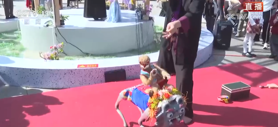 在泉州,过年还有一件事是看踩街。踩街是融合了民俗表演和巡游的活动,踩街队伍一边行进一边演出,现场已经演起来了。泉州地区特色舞蹈“火鼎公婆”,表演者以诙谐的舞步进行着非常幽默的表演,舞狮队伍3只狮子灵动活泼,不断和观众互动。还有大鼓凉伞表演队伍,伞随鼓动,翩翩起舞,在现场远远地都能感受到欢快热烈。 这个春节,由蟳埔女、惠安女、高甲戏、掌中木偶、拍胸舞等多种非遗和民俗表演组成的踩街队伍,会在泉州的各地开展280多场的踩街活动。 千年非遗焕新彩:提线木偶与机器狗同台共演