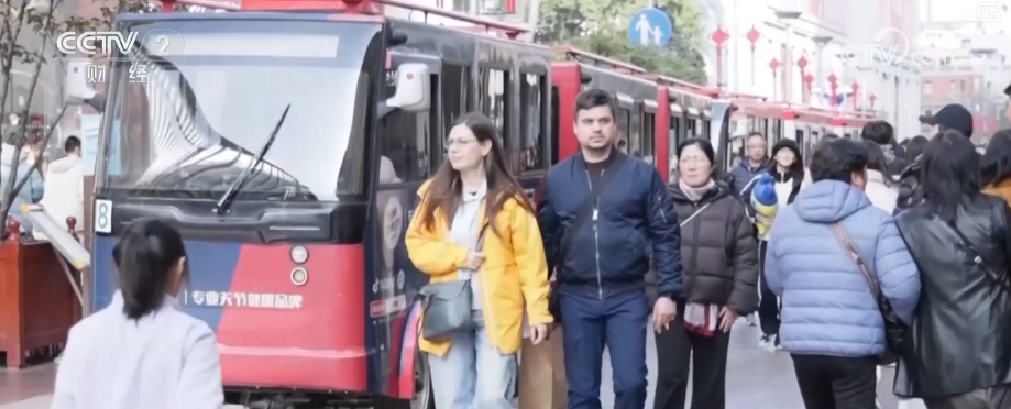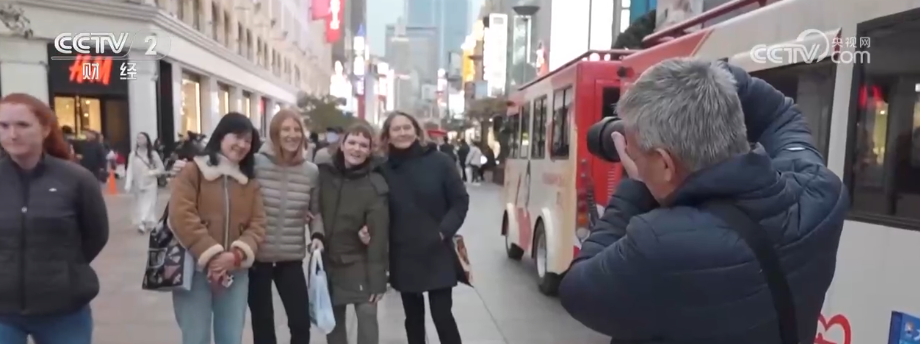 在上海的南京路步行街,来自意大利的4人家庭团正在导游的带领下游览。女儿奥诺拉表示,他们是通过社交媒体了解到中国免签政策后,专程来体验“中国之旅”的。