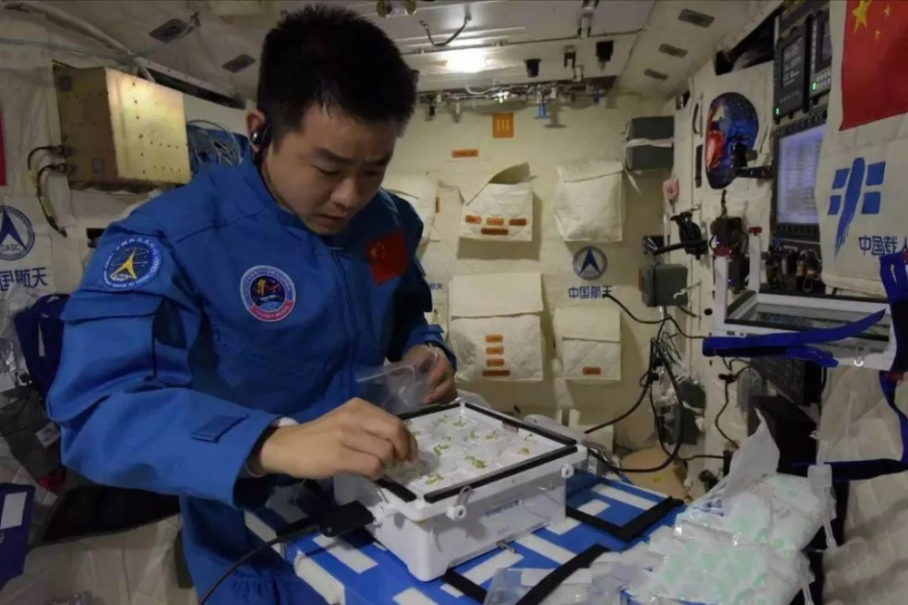 2016年,天宫二号空间实验室内,神舟十一号航天员景海鹏、陈冬小心细致地播种下生菜种子,这是中国人首次在太空人工栽培蔬菜。